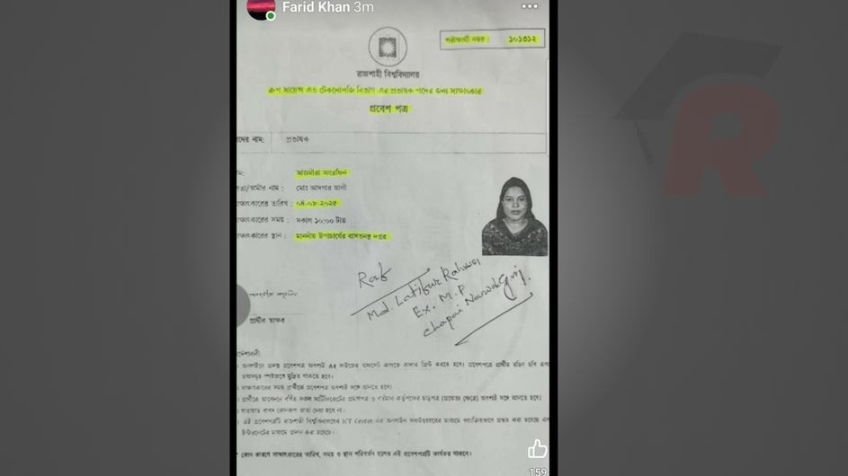 ৩ আগস্ট রাত ১২টার দিকে দেওয়া ওই স্টোরিতে দেখা যাচ্ছে বিশ্ববিদ্যালয়ের ক্রপ সায়েন্স অ্যান্ড টেকনোলজি বিভাগে প্রভাষক নিয়োগের প্রবেশপত্রে চাঁপাইনবাবগঞ্জের সাবেক এমপি (জামায়াত) মো. লতিফুর রহমান সুপারিশ করেছেন। তিনি চাঁপাইনবাবগঞ্জ-৩ আসনের দুইবারের সাবেক এমপি। ১৯৮৬ ও ১৯৯১ সালের সংসদ সদস্য হিসেবে নির্বাচিত হয়েছিলেন।