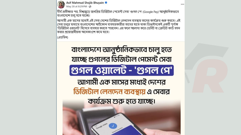 তিনি বলেন, ‘দীর্ঘ প্রতীক্ষার পর, বিশ্বজুড়ে জনপ্রিয় ডিজিটাল পেমেন্ট সেবা ‘গুগল পে’ আনুষ্ঠানিকভাবে বাংলাদেশে চালু হতে যাচ্ছে।’